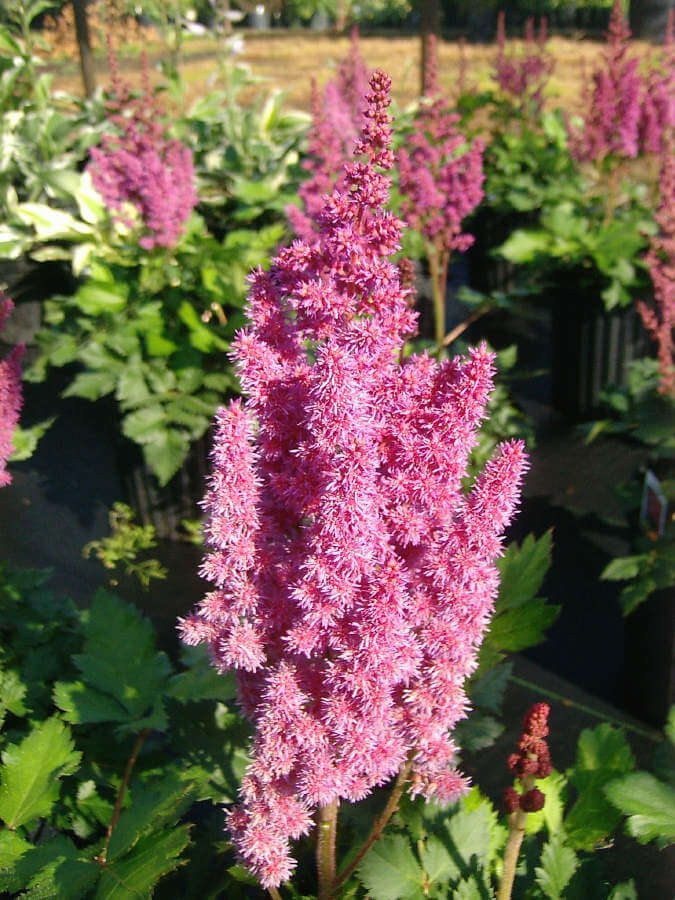 Астильба Арендса Pumila — многолетнее декоративноцветущее растение с плотными малиново-розовыми соцветиями ромбической формы. Образует кустики высотой 15-20 см с прямостоячими стеблями, на которых в августе появляются пышные метельчатые соцветия. Листья ярко-зеленые, имеют сложную форму с зубчатыми краями.