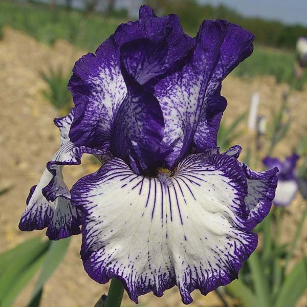 Многолетний ирис Art Deco превосходный сорт. Стандарты тёмно-фиолетовые с белым вкраплением в центре. Фолы белоснежные с чёткой красиво нарисованной тёмно-фиолетово-синей каймой шириной 1 см. Бородка жёлтая, на конце синяя. Обильно цветущий сорт. На цветоносе 8-12 бутонов.