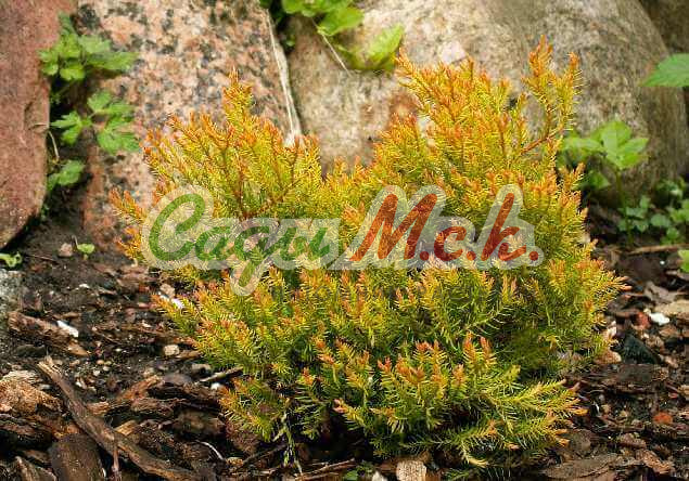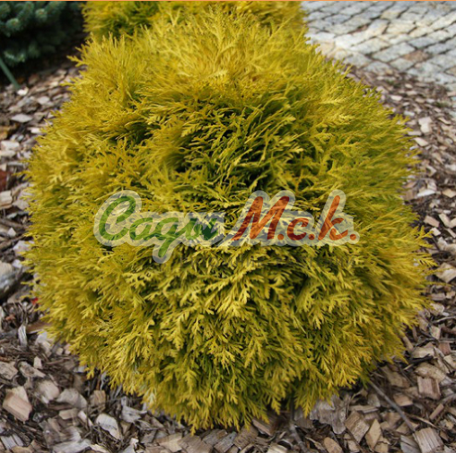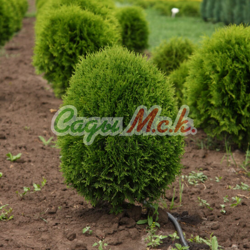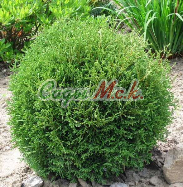 Туя западная Recurva Nana - карликовый кустарник до 2 м высоты и такого же диаметра. Крона шаровидная. Ветви прямые и восходящие. Веточки скрученные. Хвоя чешуйчатая, густая, матово зеленая, зимой буровато-зеленая.